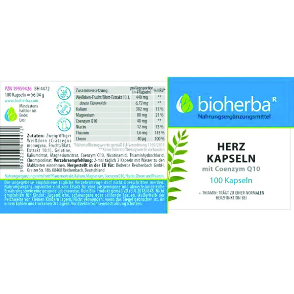 Die Herz Kapseln mit Coenzym Q10 von Bioherba kombinieren einen 10:1-Extrakt aus Zweigriffigem Weißdorn (Crataegus monogyna, Frucht/Blatt) mit ausgewählten Mikronährstoffen und Coenzym Q10. Ergänzt wird die Zusammensetzung durch Kaliumcitrat, Magnesiumcitrat, Nicotinamid, Thiamin (Thiaminhydrochlorid) sowie Chrom (Chrompicolinat). Die Kapselhülle besteht aus Gelatine und ermöglicht eine einfache Einnahme im Alltag.