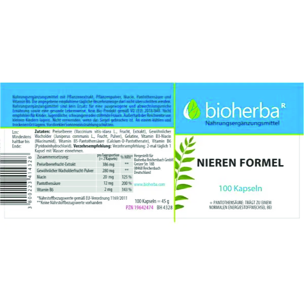 Entdecken Sie die sorgfältig zusammengestellte Nieren Formel von Bioherba, eine harmonische Komposition ausgewählter Zutaten, die darauf abzielt, Ihren Alltag auf natürliche Weise zu bereichern. Diese Formel vereint Preiselbeere und Gewöhnlichen Wacholder in einer Kapsel, ergänzt durch eine sorgfältig abgestimmte Mischung aus Vitaminen B3, B5 und B6, um eine ausgewogene Unterstützung zu bieten. Unsere Nieren Nahrungsergänzungsmittel, verpackt in praktischen Kapseln, sind ideal für alle, die auf natürliche Weise ihr Wohlbefinden unterstützen möchten.