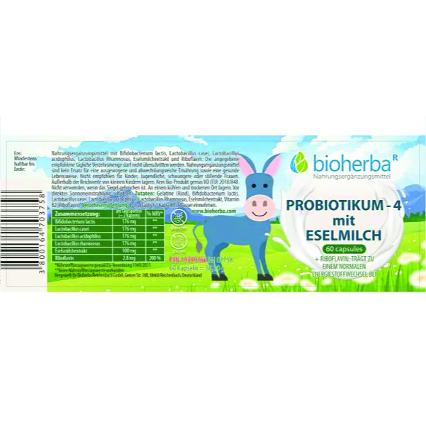 Unsere Probiotikum 4 mit Eselsmilch Kapseln kombinieren vier sorgfältig ausgewählte probiotische Bakterienstämme mit hochwertigem Eselsmilchextrakt und Vitamin B2 (Riboflavin) – abgestimmt zur Ergänzung Ihrer täglichen Ernährung.